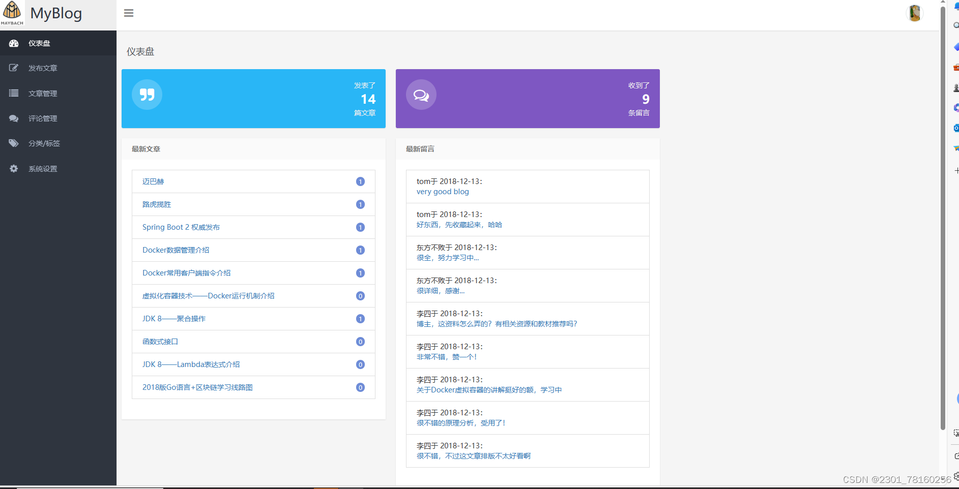 文章管理模块 单击页面左侧的[发布文章]面板链接进入到文章编辑页面并进行文章的编辑。3、在后台管理控制类AdminController中添加页面跳转请求的方法,包括跳转到文章发布页面的请求方法、发布文章请求的方法以及成功发布文章后跳转到文章管理列表的请求方法。6、文章编辑页面可以编辑文章标题、标签和文章内容。如果单击图10- 1负面下方的[保存文章]按钮,会弹出一个“文章保存成功”的提示消息并跳转到文章列表管理页面。1、编写Service层接口方法:在文章业务接口IArticleService中添加修改文章的方法。