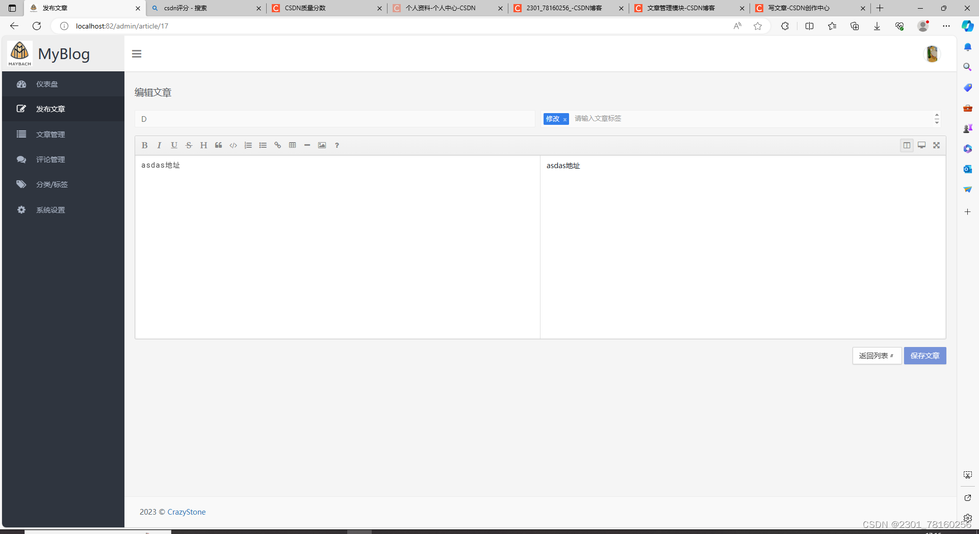 6、文章编辑页面可以编辑文章标题、标签和文章内容。如果单击图10- 1负面下方的[保存文章]按钮,会弹出一个“文章保存成功”的提示消息并跳转到文章列表管理页面