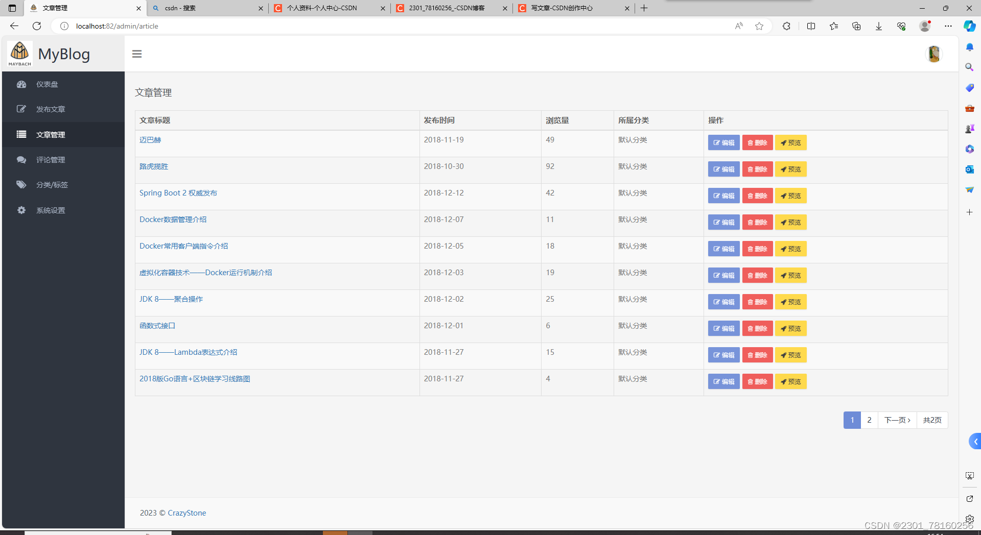 2.5、启动项目,通过浏览器访问“http//localhost/arlicle”,发现需要通过登录才能进入后台。进入后台文章管理页面,删除新创的文章后,会跳转到文章管理列表页面,该页面已经没有刚删除的文章