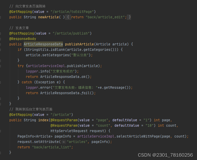 3、在后台管理控制类AdminController中添加页面跳转请求的方法,包括跳转到文章发布页面的请求方法、发布文章请求的方法以及成功发布文章后跳转到文章管理列表的请求方法