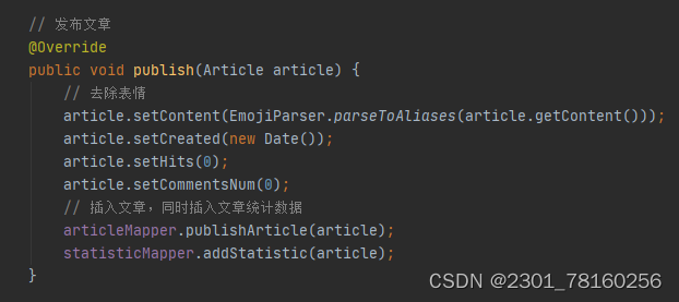 2、编写Service层接口实现类方法:在文章业务层接口实现类ArticleServicelmol中实现publish()方法