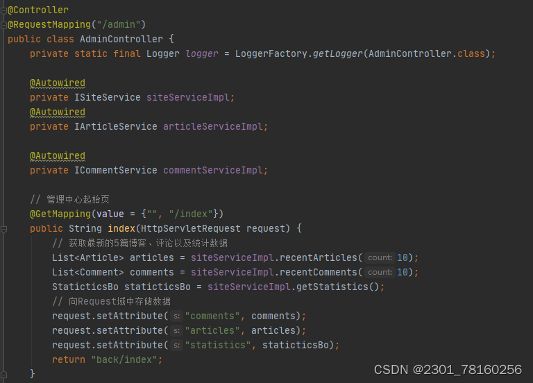 1.3、在后台管理控制类AdminController 中定义两个方法,分别用于处理跳转到文章修改面和