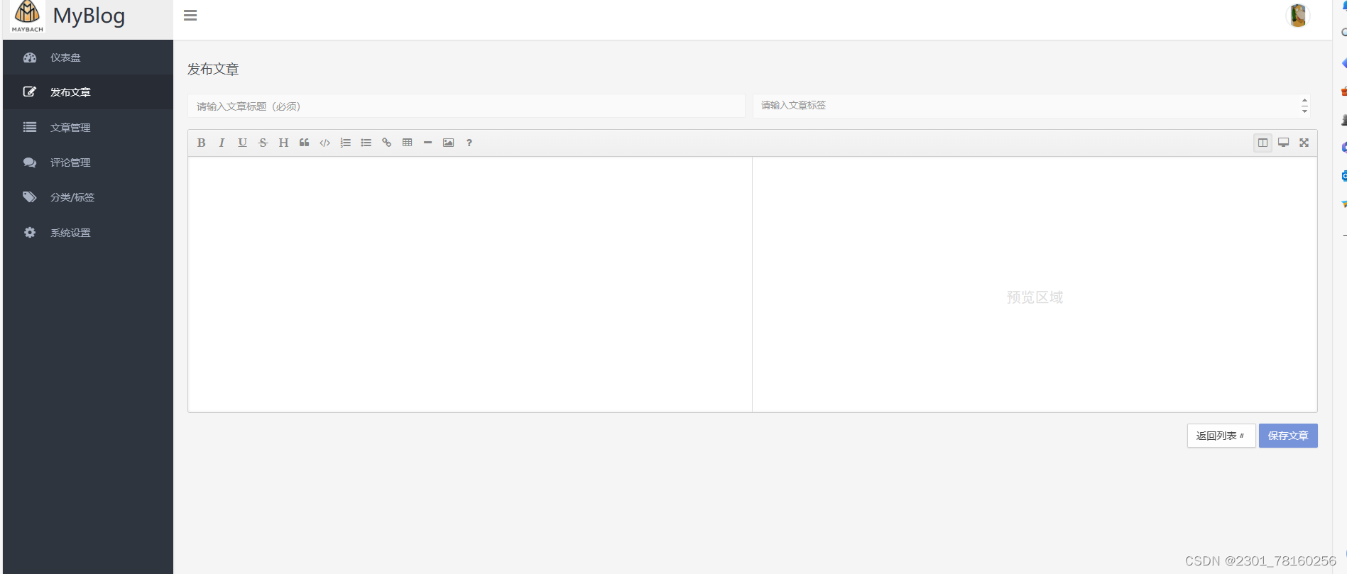 5、启动项目进行测试,项目启动成功后,先登录;在项目前端首页单击左上角的[后台管理1链接直接进入博客系统后台首页;单击页面左侧的[发布文章]面板链接进入到文章编辑页面并进行文章的编辑