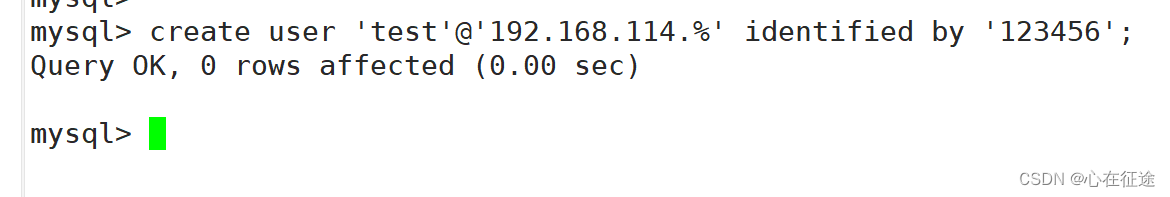 先创建一个用户:create user 'test'@'192.168.%.%' identified by 'abc123';
