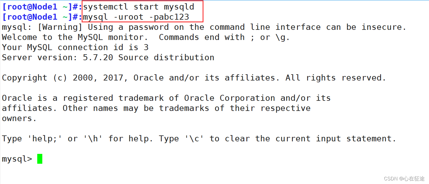 [root@Node1 ~]#:mysql -uroot -pabc123 #进到了数据库里面,分为客户端指令和数据库服务端指令