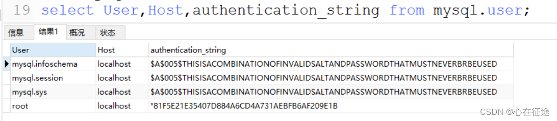 其中我们关注的三个字段是User用户名,Host位置(主机名本地或远端),authentication_string密码。这里的密码不叫password!