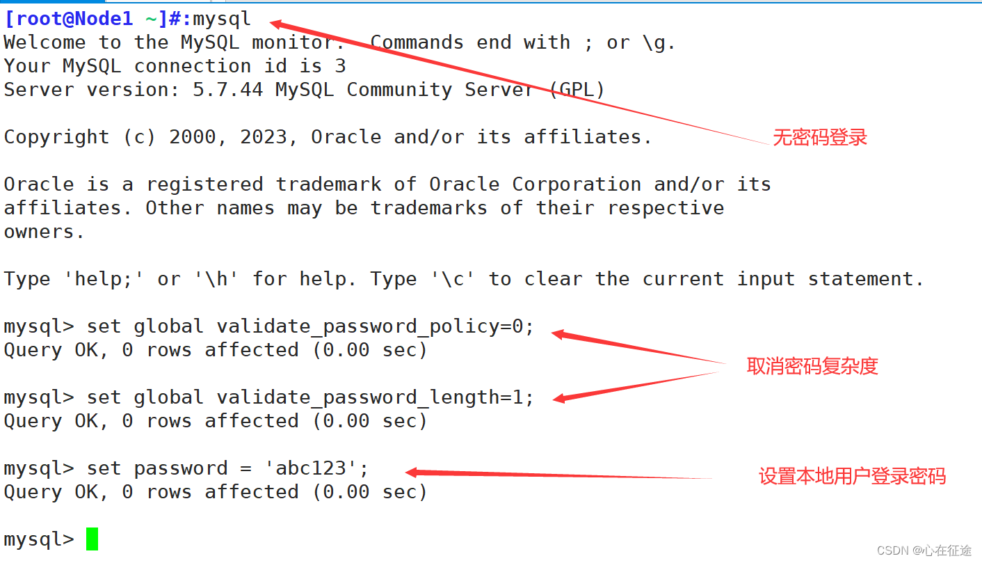 无密码登录进去。需要重新取消密码复杂度(两条命令)。修该密码:set password = 'abc123';