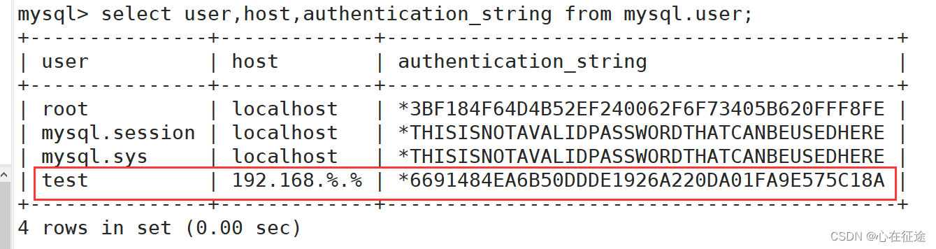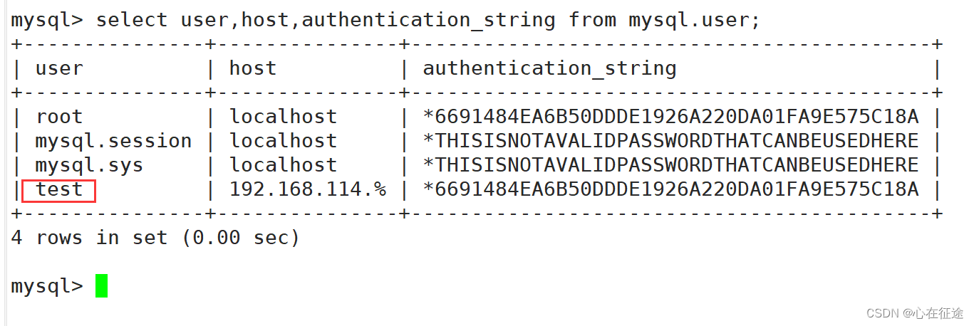 现在的用户名是test。查看:select user,host,authentication_string from mysql.user;
