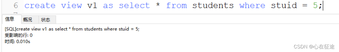 创建视图:create view v1 as select * from students where stuid=5;