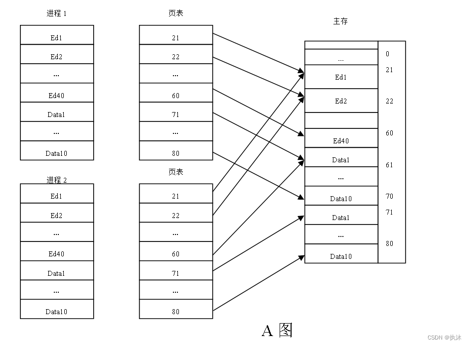 序有160KB的代码和加外40KB的数据区,由总共需有8MB的内存空间来个用户。如果160KB的代码是可重入的,则无论是在分页系统还是在分段系统中,该代码都能被共享,在内存中只需保留一份文本编辑程序的副本,此时所需要的内存空间仅为1760KB(160+40*40),假定每个页面的大小为4KB,那么160KB的代码将占用40个页面,数据区占10个页面。为实现代码的共享,应在每个进程的页表中都建立40个页表项,它们的物理块号都是21#~~60#。在每个进程的页表中,还须为自己的数据区建立页表项,它们的物理块号分别是61#~~70#,71#~~80#,81#~~90#,…,等等,如A图为分页系统中共享editor的示意图。