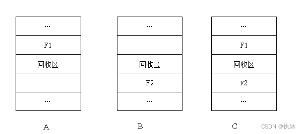 - 回收区同时与插入点的前、后两个分区相邻接,见图(C)。此时将三个分区合并使用F1的首址,取消F2的表项,大小为三者之和。