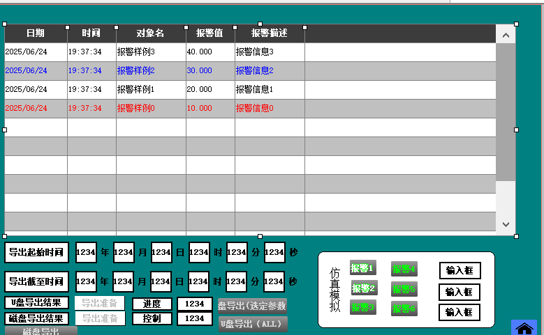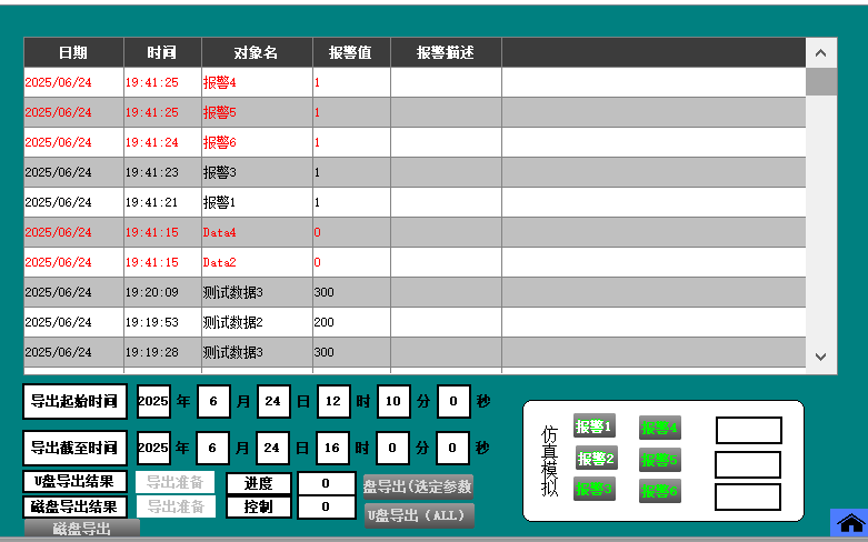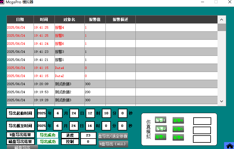 ret=!ExportHisDataToCSV(文件名,"Mcgs_HistoryAlarm","",InputSTime,InputETime,20000,1,"",进度,控制)
