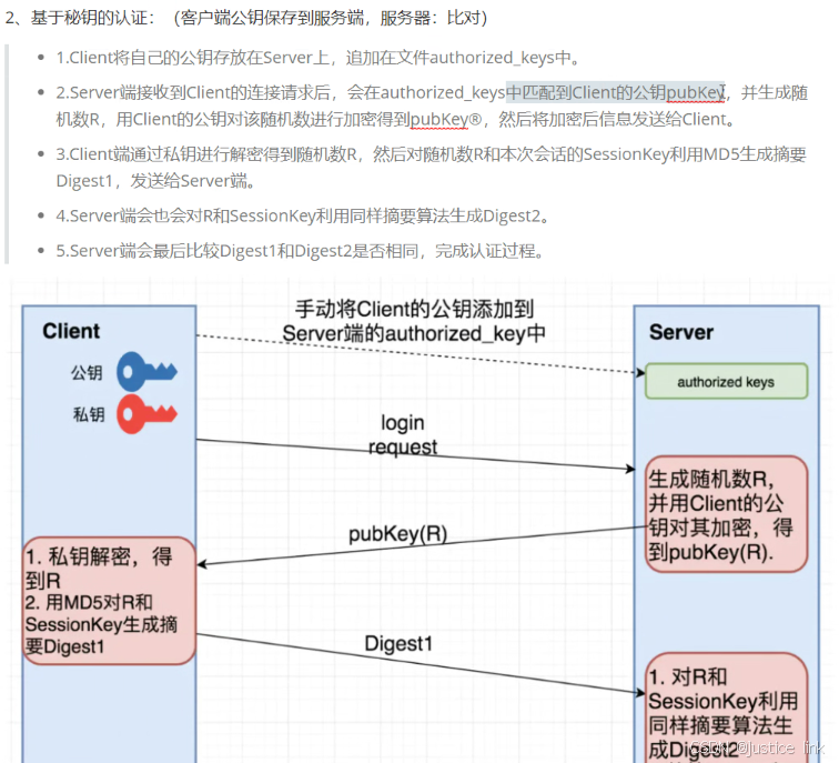 客户端产生一对公共密钥,将公钥保存到将要登录的服务器上的那个账号的家目录的.ssh/authorized_keys文件中,认证阶段:客户端首先将公钥传给服务器端。服务器端收到23后会与本地该账号家目录下的 authorized_keys中的公钥进行对比,如果不相同,则认证失败;否则服务端生成一段随机字符串,并先后用客户端公钥和会话密钥对其加密,发送给客户端。客户端收到后将解密后的随机字符串用会话密钥发送给服务器。如果发回的字符串与服务器端之前生成的一样,则认证通过,否则,认证失败。