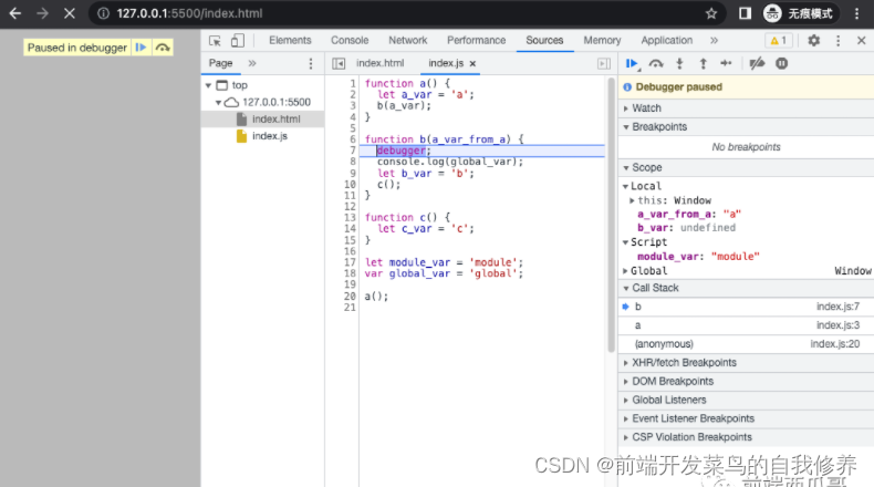 现在是 a 函数调用了 b 函数,b 函数调用的时候用 debugger 加了个断点,于是我们就停在这里了。