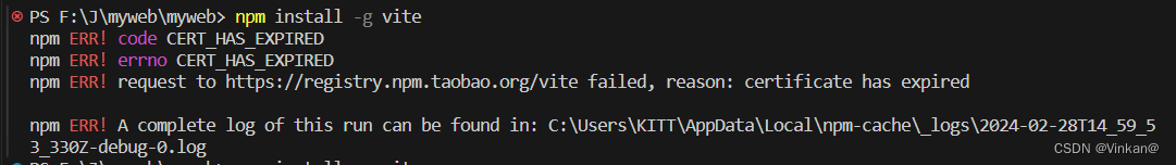 提示淘宝镜像vite安装路径请求失败!原因证书过期 。竟然过期那么就用默认镜像安装吧。👌