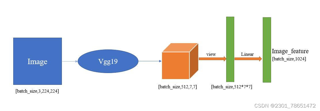 Step3:然后再将Feature经过一些变换(这里做的是展平处理)变成[batch_size,512*7*7],然后再经过一个线性层得到image_feature,其中Image_feature的size为:[batch_size,1024]。