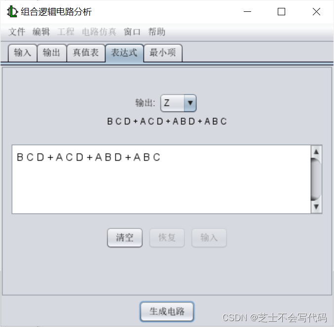 1位全加器 No. 4 / 10 使用Logsim的提供的“分析组合逻辑电路”的智能功能,重新完成 4路表决器实验。 步骤如下: