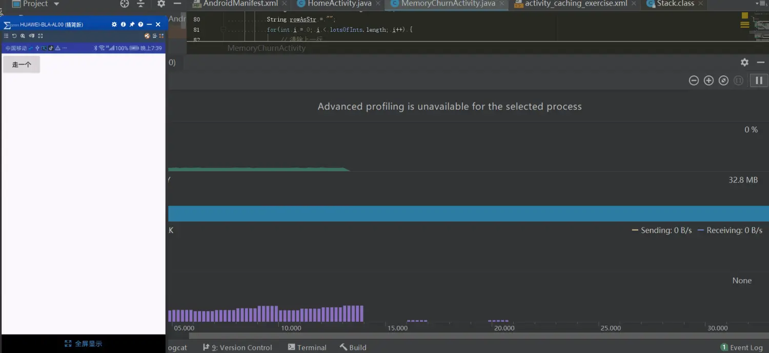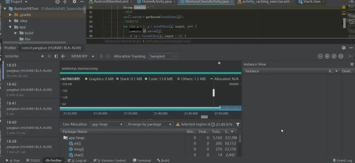 最后我们之后是 onClick 中的 imPrettySureSortingIsFree() 函数里面的 rowAsStr += sorted[j]; 字符串拼接造成的 内存抖动 ,因为每次拼接一个 String 都会申请一块新的堆内存,那么怎么解决这个频繁开辟内存的问题了。其实在 Java 中有 2 个更好的 API 对 String 的操作很友好,相信应该有人猜到了吧。没错就是将 此处的 String 换成 StringBuffer 或者 StringBuilder,就能很完美的解决字符串拼接造成的内存抖动问题。