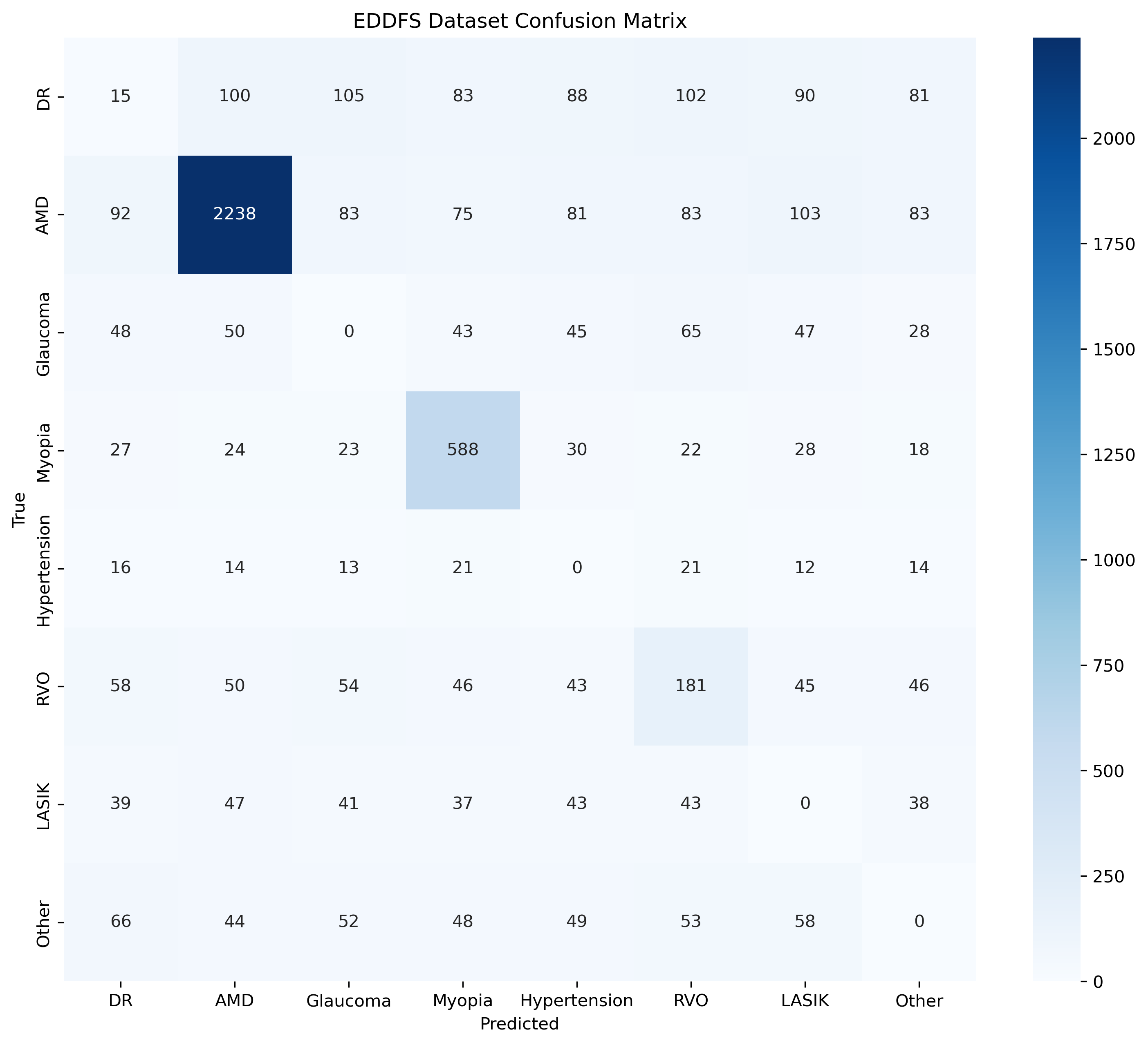 完全失效的类别:青光眼(Glaucoma)、LASIK术后斑、其他(Other)类别的正确预测数均为0,表明模型完全无法识别这些疾病。