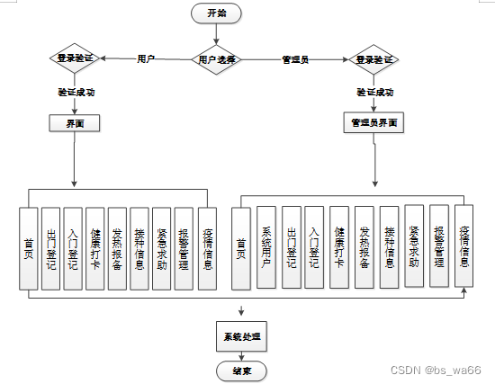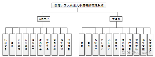 本系统主要包含了登录、系统用户、出门登记、入门登记、健康打卡、发热报备、接种信息、紧急求助、报警管理、疫情信息等多个功能模块。下面分别简单阐述一下这几个功能模块需求。不同的权限对应相应的功能模块的需求,管理员权限的级别是最高的,所以所对应的需求是最多的,根据不同的权限分别简单阐述一下各个权限的需求。