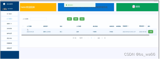 入门登记;在入门登记页面中查看入门日期、居民用户、姓名、入门类型、备注信息等内容;并进行详细操作,如图5-4所示。