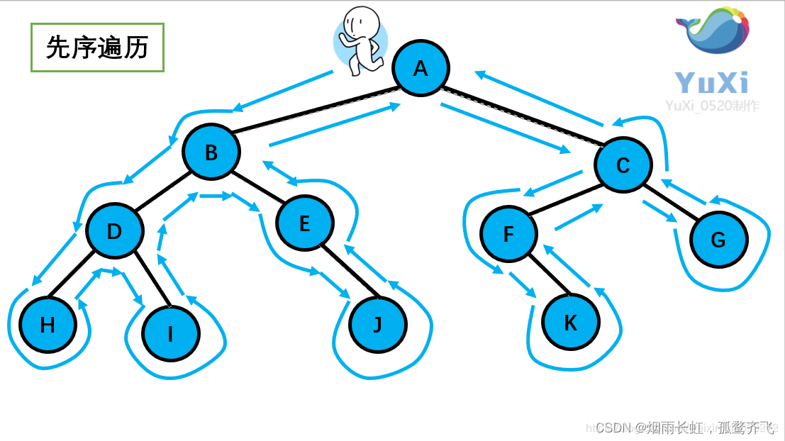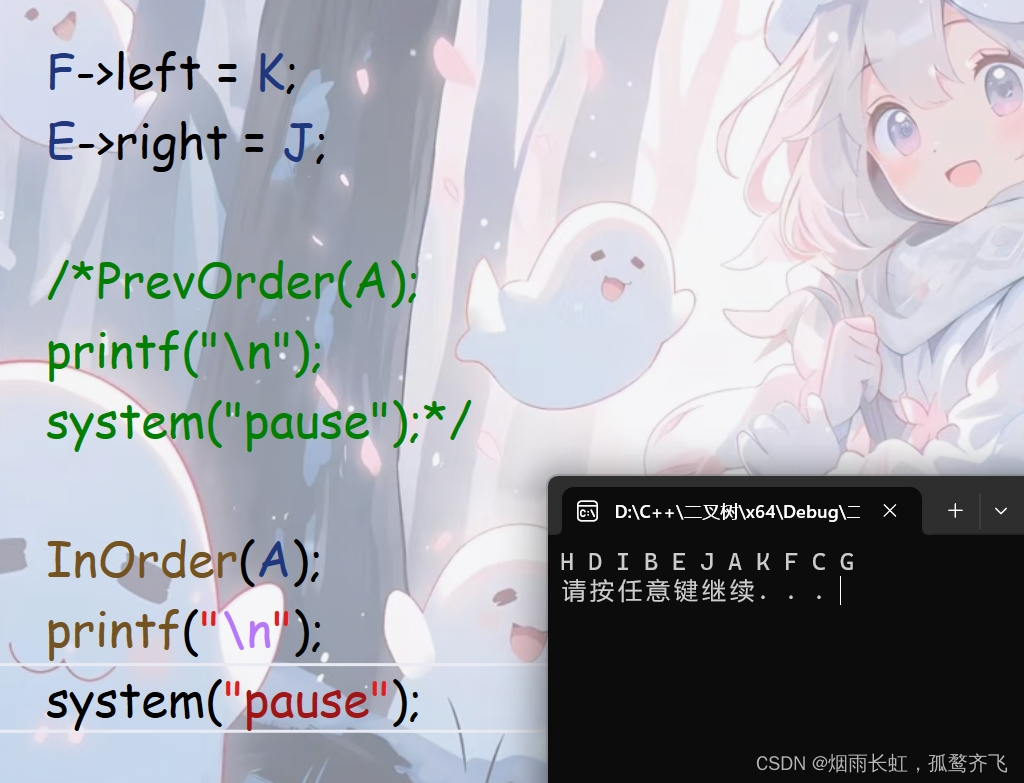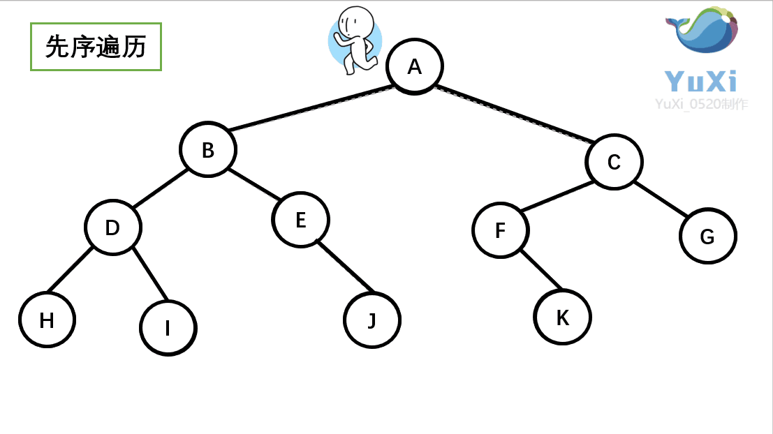 void PrevOrder(BTNode* root) { if (root == NULL) { return; } printf("%c ", root->data); PrevOrder(root->left); PrevOrder(root->right); }int main() { BTNode* A = (BTNode*)malloc(sizeof(BTNode)); A->data = 'A'; A->left = NULL; A->right = NULL; BTNode* B = (BTNode*)malloc(sizeof(BTNode)); B->data = 'B'; B->left = NULL; B->right = NULL; BTNode* C = (BTNode*)malloc(sizeof(BTNode)); C->data = 'C'; C->left = NULL; C->right = NULL; BTNode* D = (BTNode*)malloc(sizeof(BTNode)); D->data = 'D'; D->left = NULL; D->right = NULL; BTNode* E = (BTNode*)malloc(sizeof(BTNode)); E->data = 'E'; E->left = NULL; E->right = NULL; BTNode* F = (BTNode*)malloc(sizeof(BTNode)); F->data = 'F'; F->left = NULL; F->right = NULL; BTNode* G = (BTNode*)malloc(sizeof(BTNode)); G->data = 'G'; G->left = NULL; G->right = NULL; BTNode* H = (BTNode*)malloc(sizeof(BTNode)); H->data = 'H'; H->left = NULL; H->right = NULL; BTNode* I = (BTNode*)malloc(sizeof(BTNode)); I->data = 'I'; I->left = NULL; I->right = NULL; BTNode* J = (BTNode*)malloc(sizeof(BTNode)); J->data = 'J'; J->left = NULL; J->right = NULL; BTNode* K = (BTNode*)malloc(sizeof(BTNode)); K->data = 'K'; K->left = NULL; K->right = NULL; A->left = B; A->right = C; B->left = D; B->right = E; D->left = H; D->right = I; C->left = F; C->right = G; F->left = K; E->right = J; PrevOrder(A); printf("\n"); system("pause"); return 0; }以上我们插入树节点数据