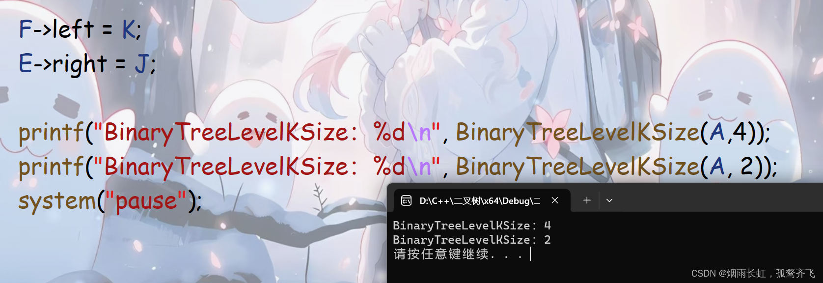 int BinaryTreeLevelKSize(BTNode* root, int k) { if (root == NULL) { return 0; } if (k == 1) { return 1; } return BinaryTreeLevelKSize(root->left, k - 1) + BinaryTreeLevelKSize(root->right, k - 1); }代码测试