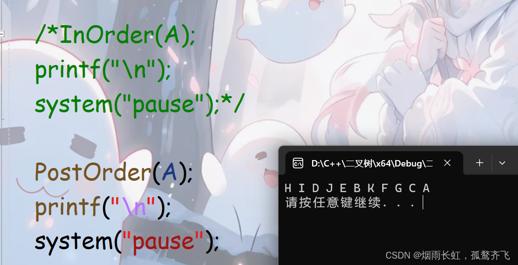 void PostOrder(BTNode* root) { if (root == NULL) { return; } PostOrder(root->left); PostOrder(root->right); printf("%c ", root->data); }代码测试