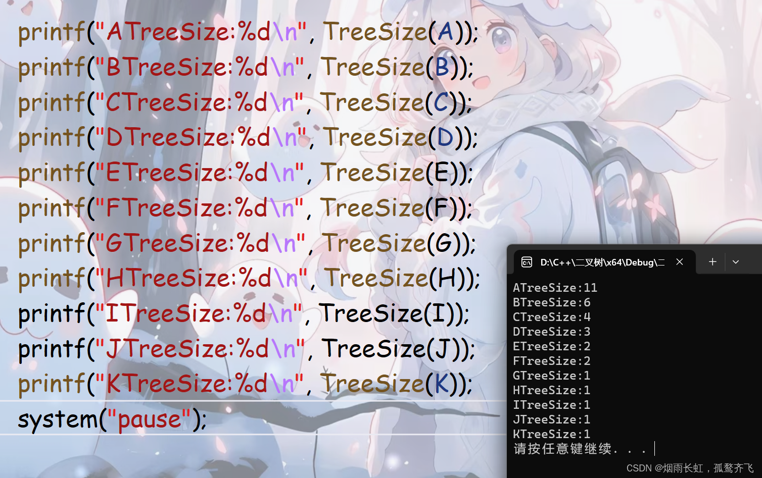 int TreeSize(BTNode* root) { return root == NULL ? 0 : TreeSize(root->left) + TreeSize(root->right) + 1; }代码测试