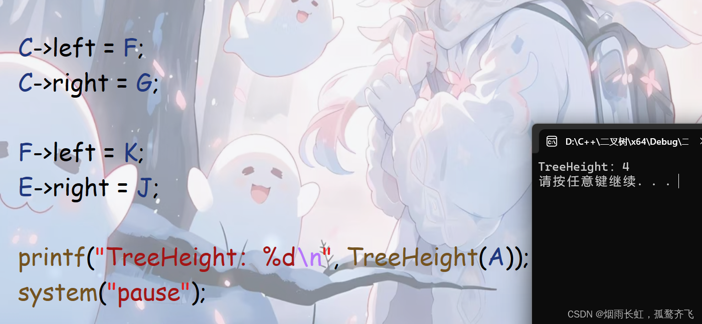 int TreeHeight(BTNode* root) { if (root == NULL) return 0; int left = TreeHeight(root->left); int right = TreeHeight(root->right); return (left > right ? left : right) + 1; }代码测试