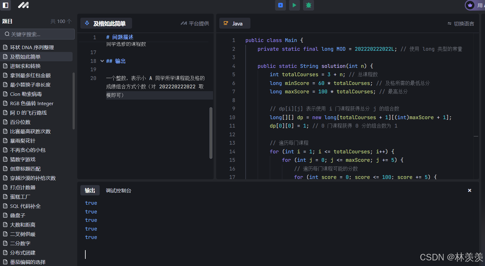 字节青训题目:及格如此简单(易) 小 A 同学选了 `n` 门选修课程,马上要期末考核了,请你帮小 A 同学算一算,如果小 A 同学要及格的话,他所学所有课程的成绩共有多少种组合的方式。为了响应国家全面发展的响应,学校提供了“德”、“智”、“体”、“美”、“劳” 等多门课程供同学们选择学习。一个整数,表示小 A 同学所学课程能及格的成绩组合方式个数(对 202220222022 取模即可)2. 每门课程满分 100 分,只有 20 道选择题,每题 5 分,答错 0 分,答对 5 分。每位同学必修 3 门课程,可选修其他 3 门及以上课程。