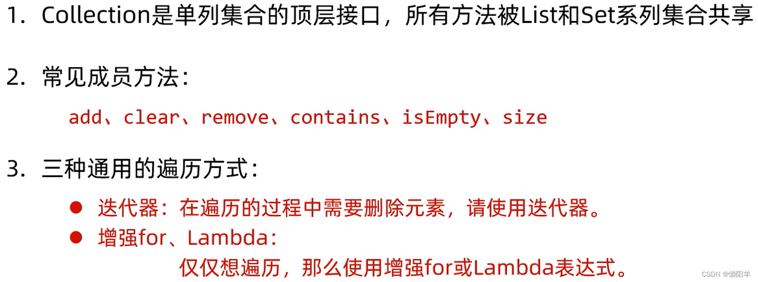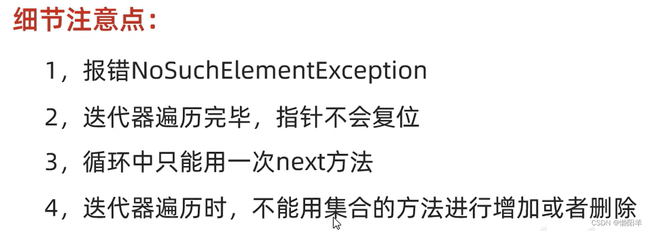 4、否则会报错(出异常根本原因是:集合中元素删除了,但是没有更新迭代器(迭代器不知道集合变化了),使用迭代器方法删除时,会自动更新迭代器,并且更新集合(删除集合中的元素))