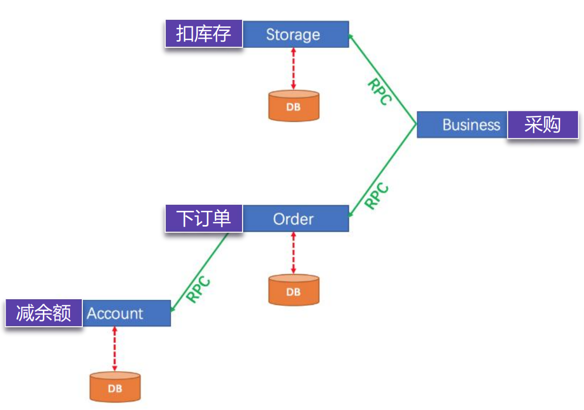 发起采购流程后,需要扣库存、生成订单、从账户中扣除指定金额,任一流程发生异常时,整个流程应当回滚。