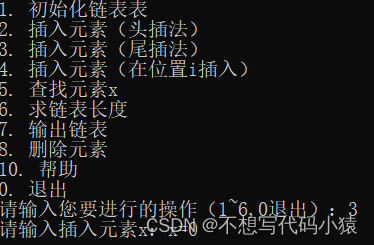 printf("3. 插入元素(尾插法)\n");