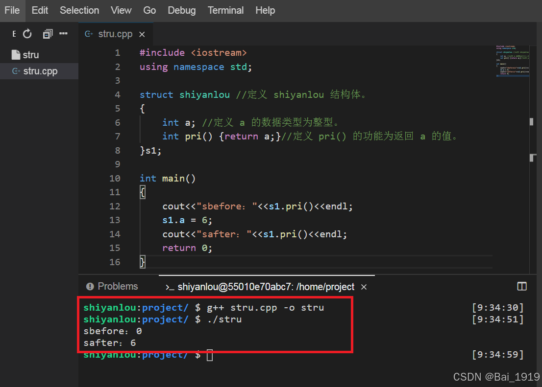 struct shiyanlou { int a; int pri() {return a;} }s1;在 C++ 的编译过程中,此结构体不会出错。但若在 C 语言中,由于