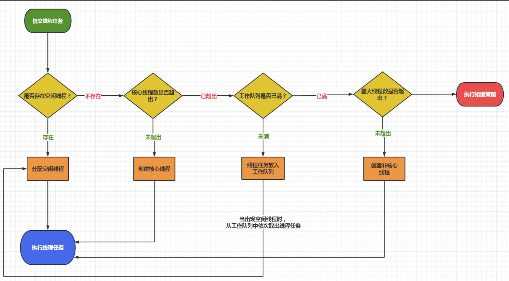 - 如果当前“存活线程数”已经达到最大线程数 maximumPoolSize ,直接采用拒绝策略处理新线程任务;