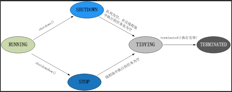 TERMINATED:终止状态,该状态表示线程池彻底关闭。