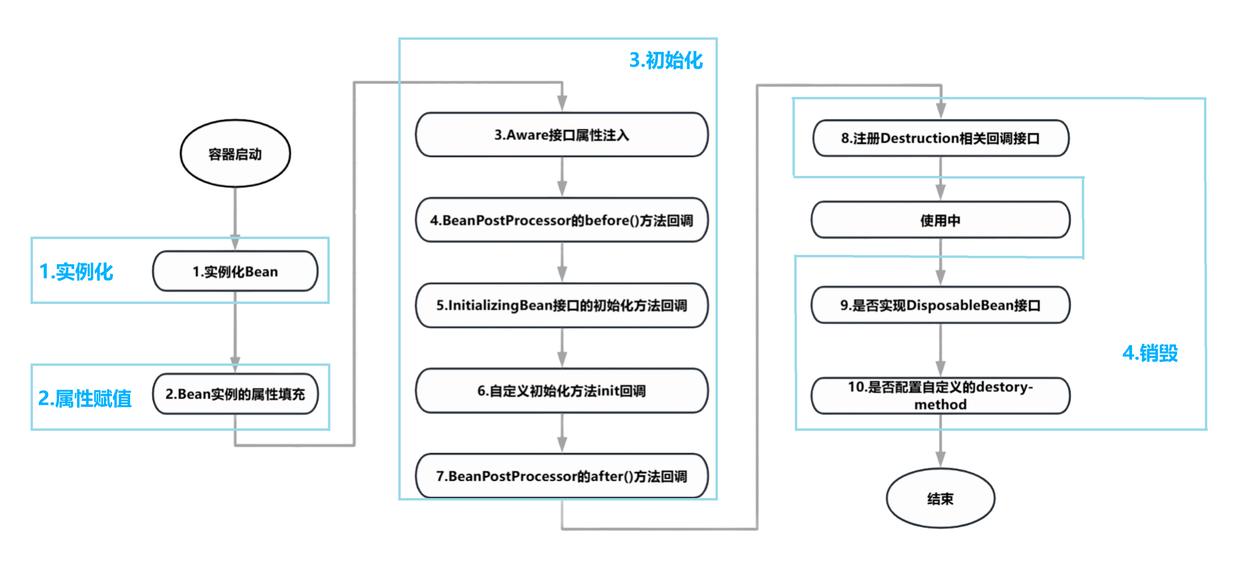 销毁(Destruction):当容器关闭时,Bean的销毁过程,也可以自定义销毁方法。