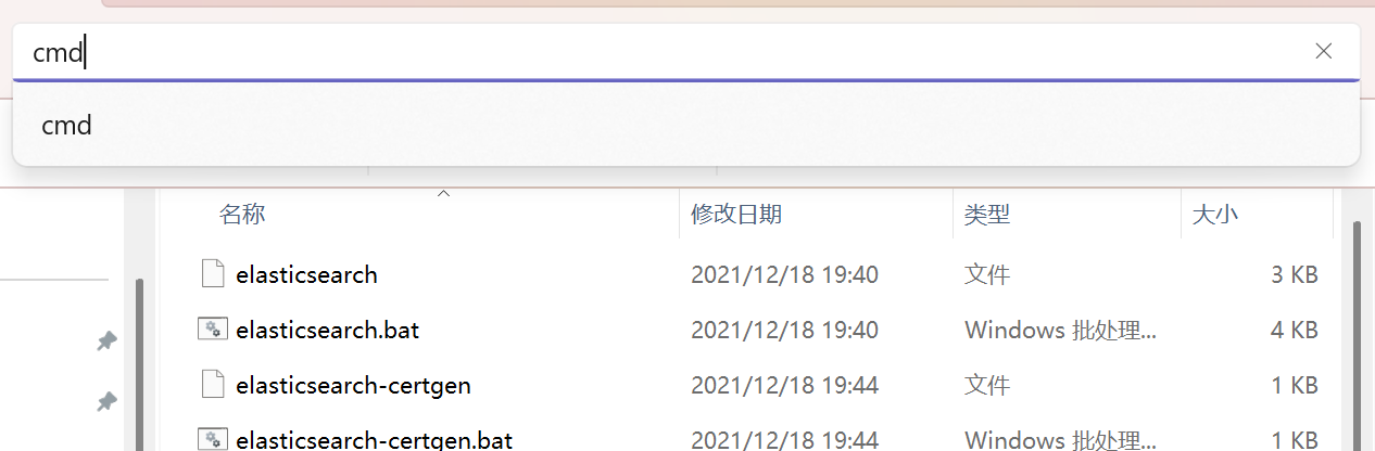 切换到ES的bin目录下在文件路径这一栏输入cmd回车进入终端,运行 elasticsearch.bat