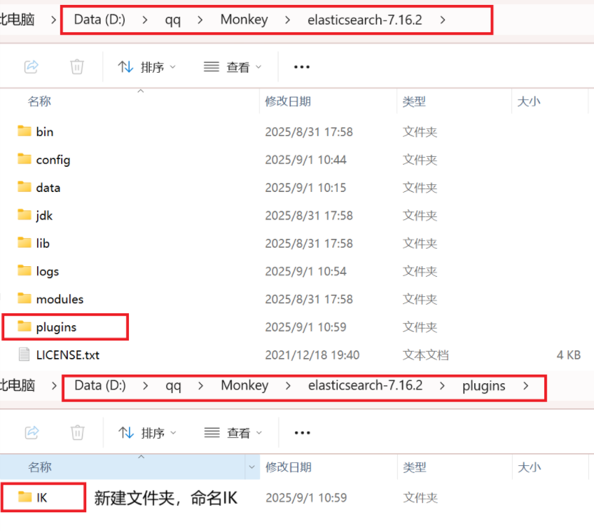 - 在ES安装目录下找到plugins目录创建ik文件夹