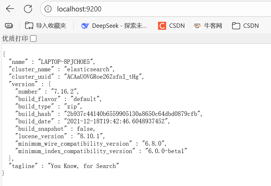 在浏览器输入localhost:9200,页面输出JSON,那你的ES就启动成功了