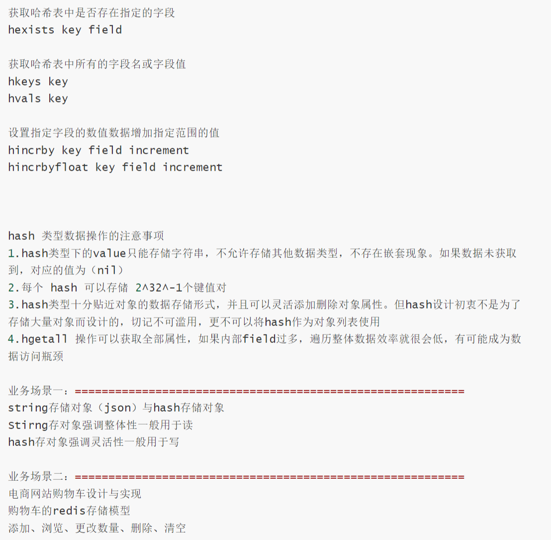 - 适合存储结构化数据(如用户信息:id、name、age 等),可单独操作某个字段(无需修改整个对象)。 占用空间比 String 存储序列化对象更高效(减少键名冗余)
