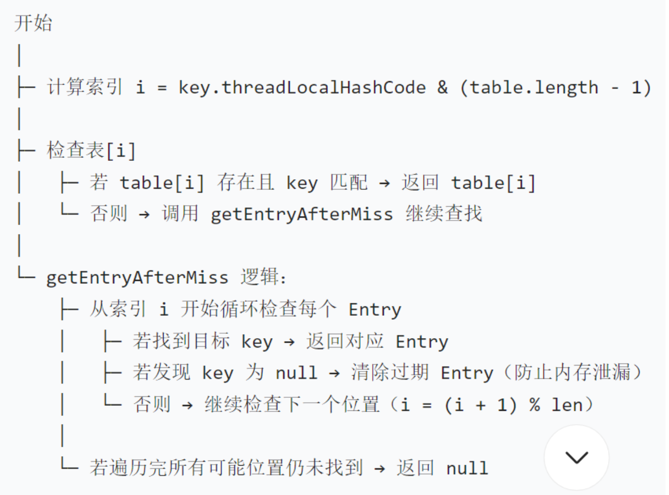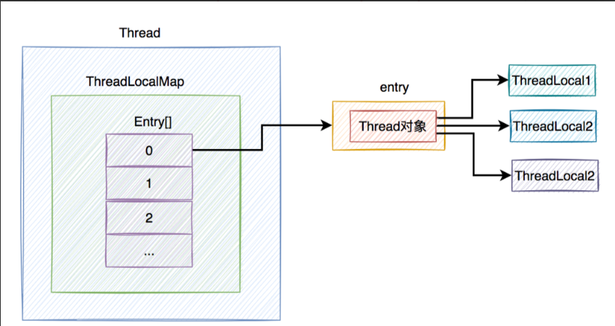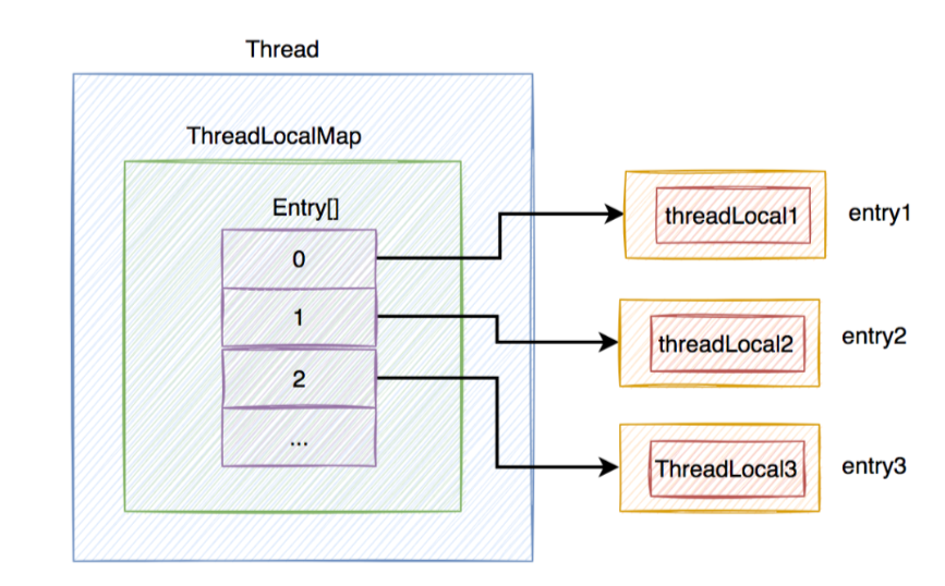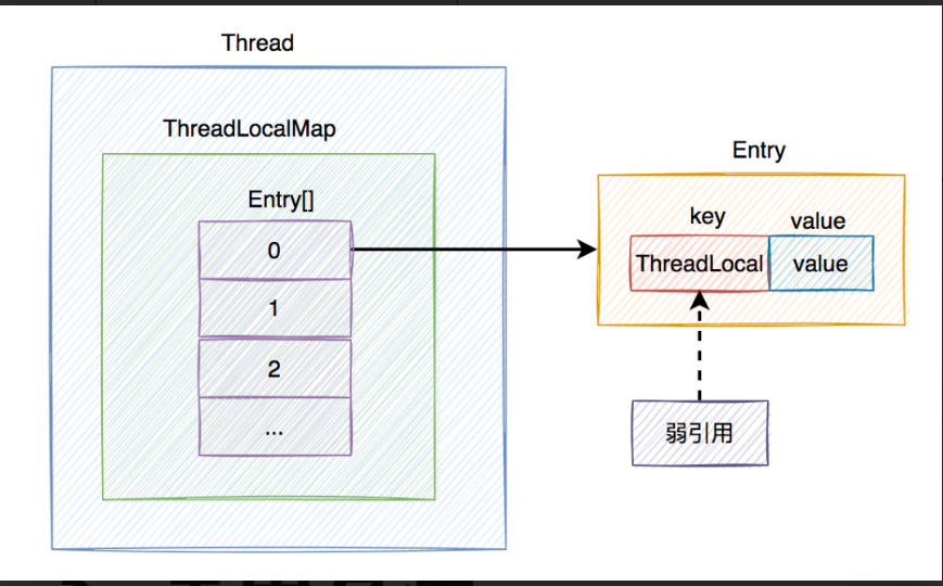 ThreadLocalMap内部数据结构是一个Entry类型的数组。每个Entry对象的Key为ThreadLocal对象,value为存储的数据