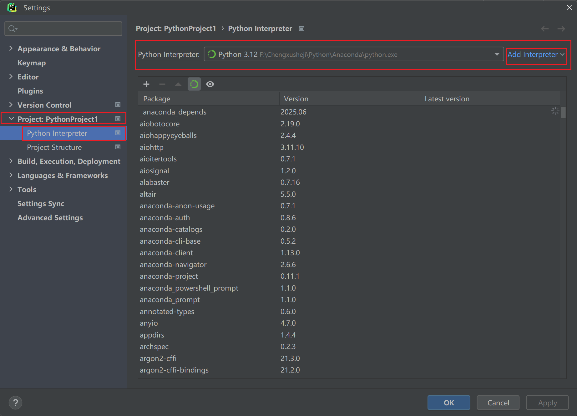 如果什么都没有显示为空,则点击Add Interpreter,添加你安装Anaconda下的python.exe文件,点击Apply使其识别下载;