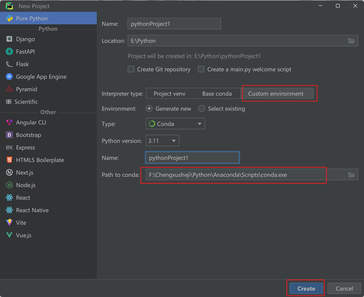 方式二:选择Custom environment自定义环境