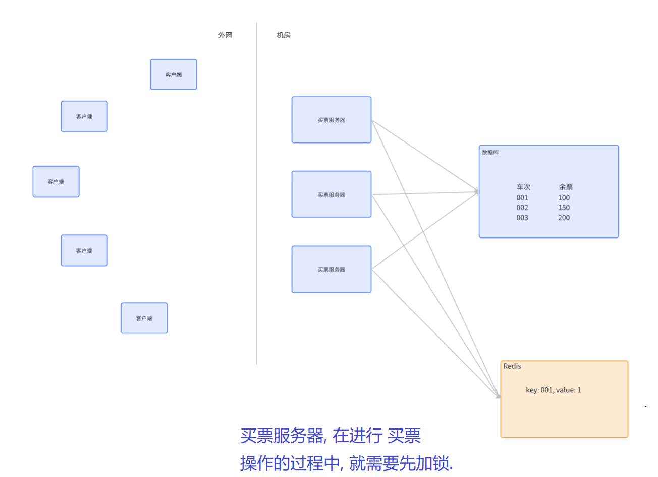 在redis中设置一个特殊的key-value,完成上述买票操作,再把key-value删除,其他服务器在也想买票的时候,就需要尝试设置key-value,如果发现key-value已经存在,就认定为加锁失败(放弃/等待)。执行完之后再删除对应的key,完成解锁操作。