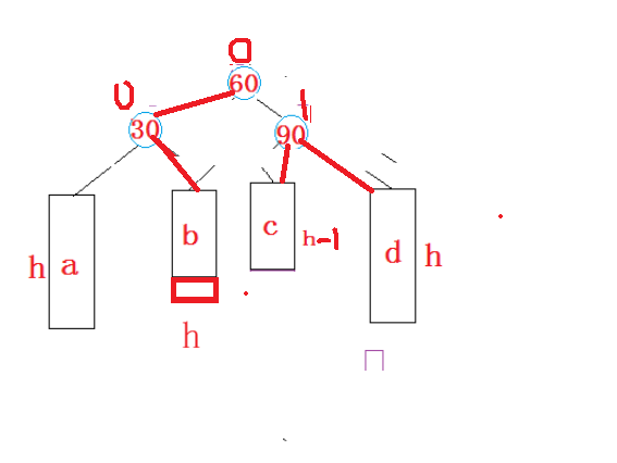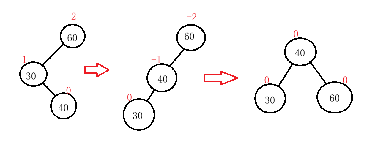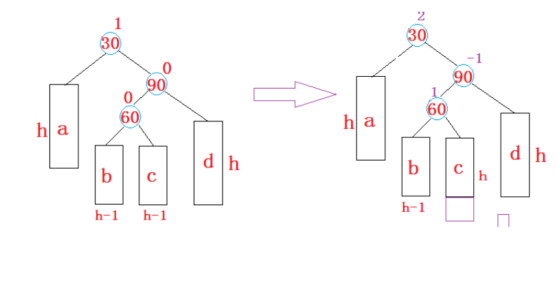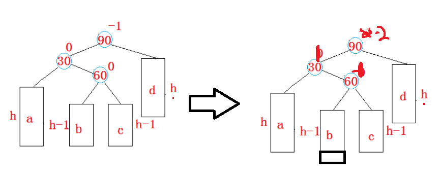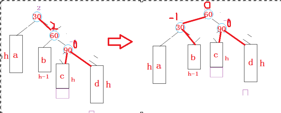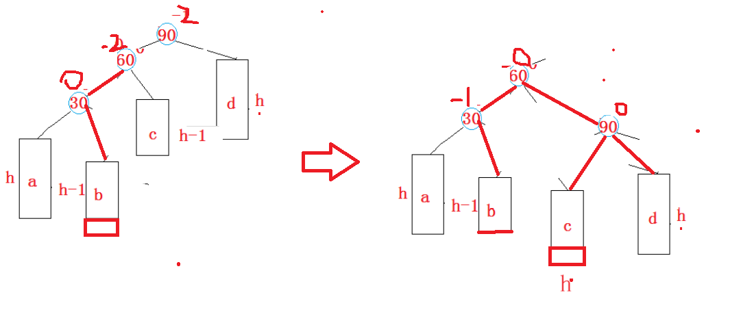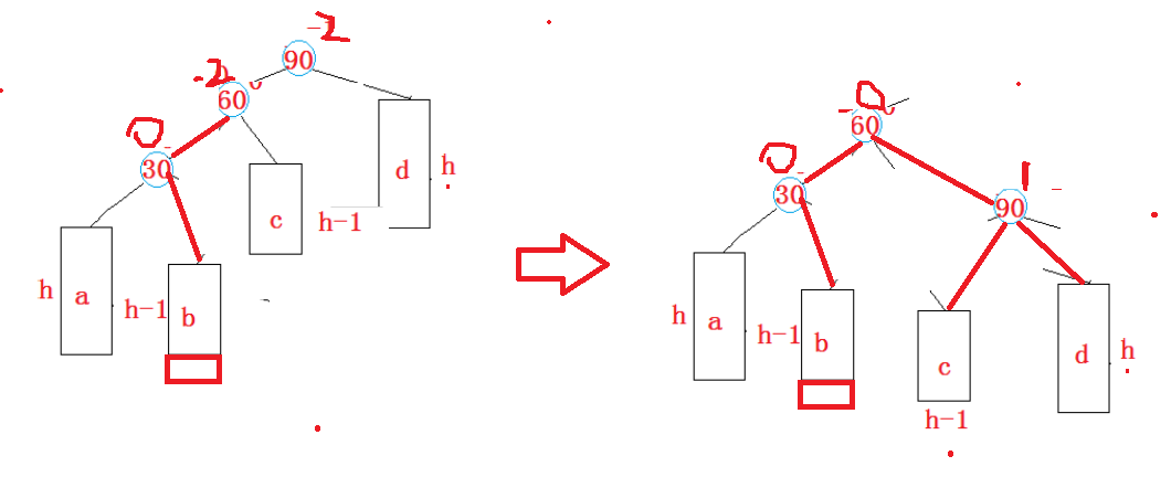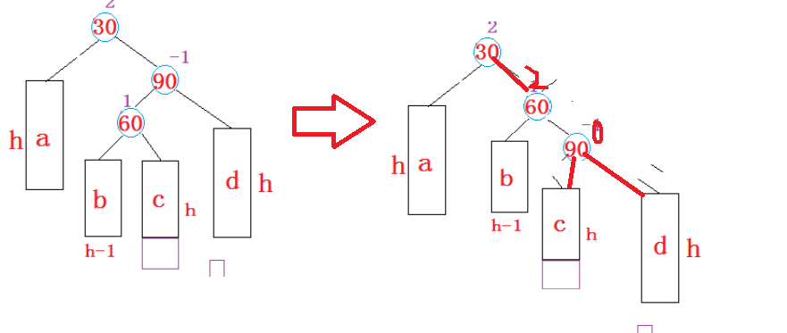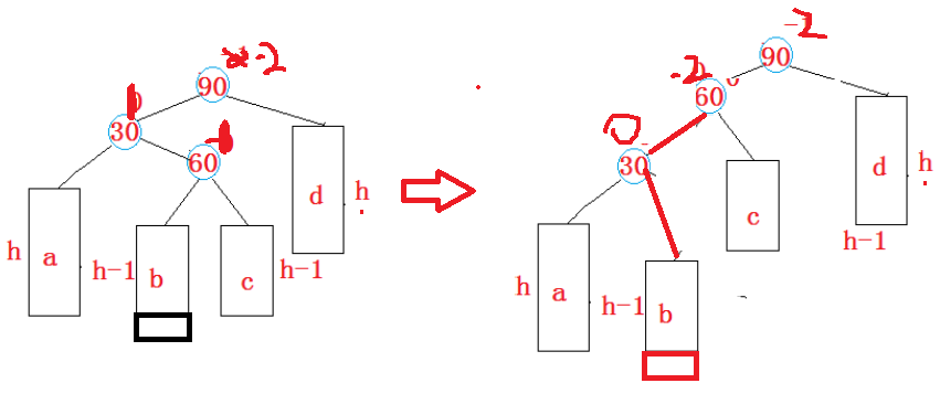 此时,只进行右旋很明显还是不能平衡,因为60的那个子树比较高,连在90的左边依旧比较高,所以先将30作为parent进行一次左旋,降低右边的高度,然后再对90进行右旋