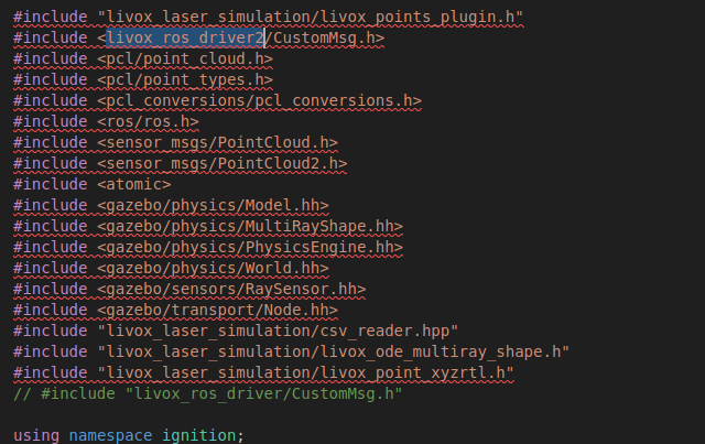 到这里编译大概率是会报错的,说livox_ros_driver找不到,这里需要开始修改文件了把livox_laser_simulation中src里面所有的livox_ros_driver全部改称livox_ros_driver2比如: