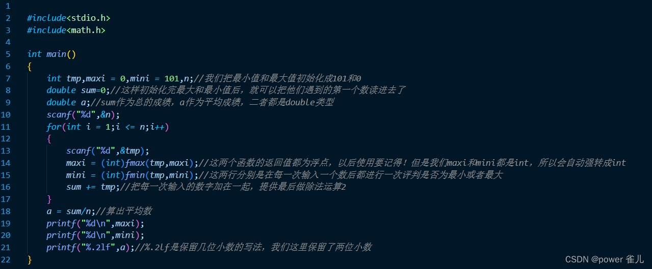 题目分析:从题目可以知道,我们需要找到最大值,最小值和平均值。最大值和最小值都比较轻松实现,使用c语言math库中来解决。而平均值我们则需要将所有的值加在一起,进行除法,保留小数,得到结果。