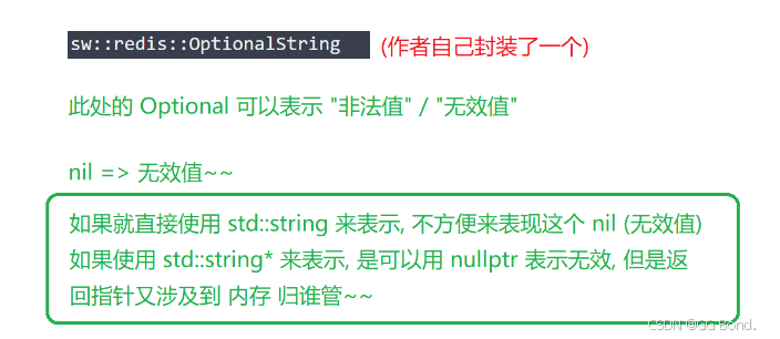 还有一个有趣的是get类型的返回值,get函数的返回值为optional, 这个类型可以用来表示两种形态,正确或者错误,正确时返回获取到的值,错误时返回的是redis中的空值nil